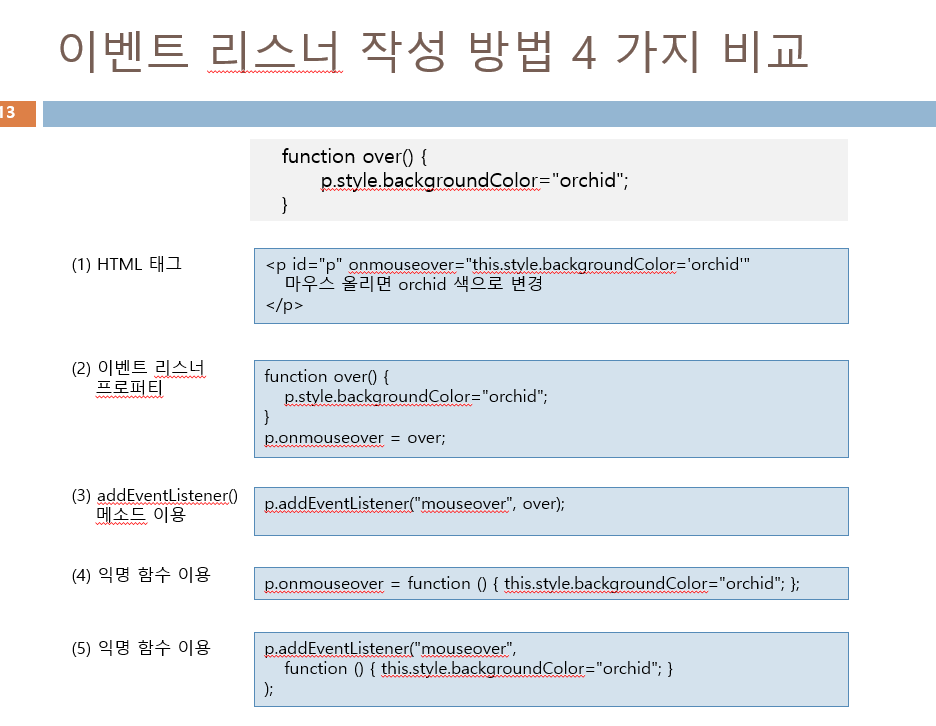 - DOM 객체의 이벤트 리스너 프로퍼티에 함수 등록